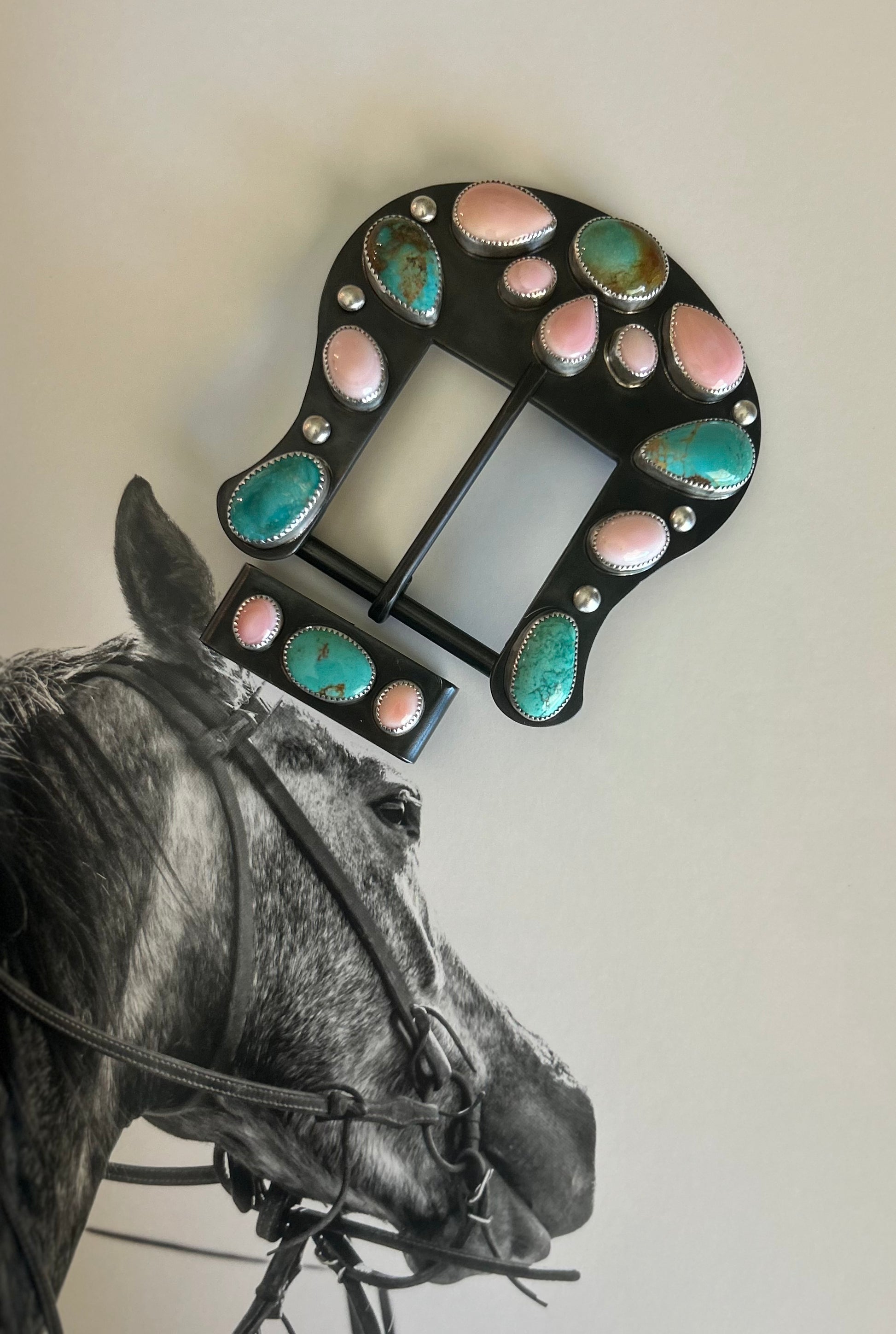Kingman and Pink Conch set in fine sterling silver on 3 1/2” x 3 1/2” steel buckle. Fits 1 1/2” belt